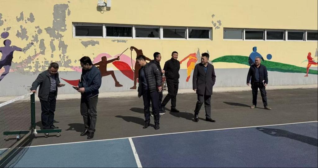 教务处副处长沈斌(左一)查看匹克球场地器材